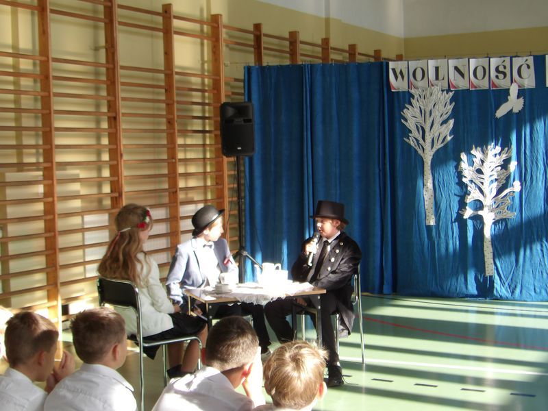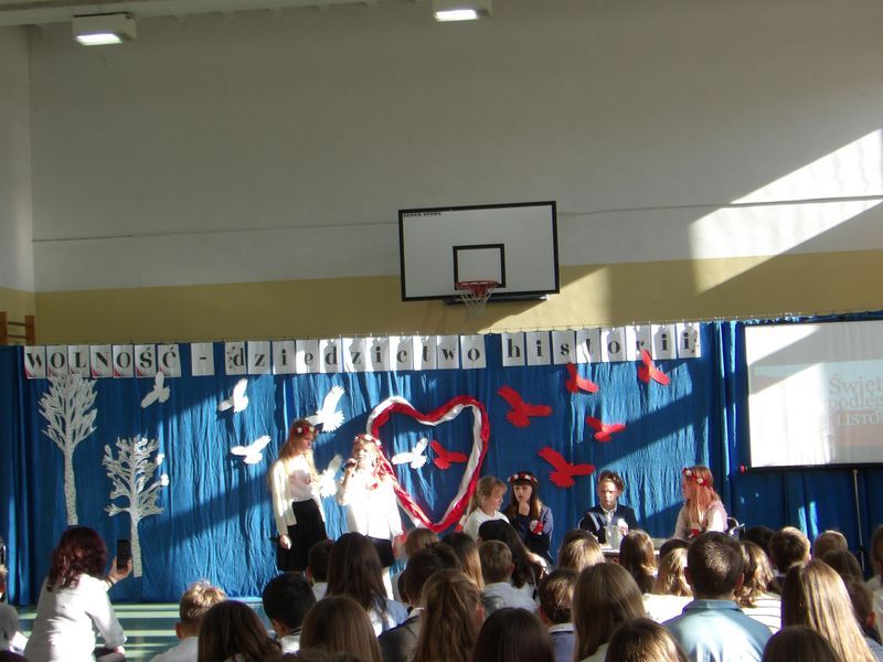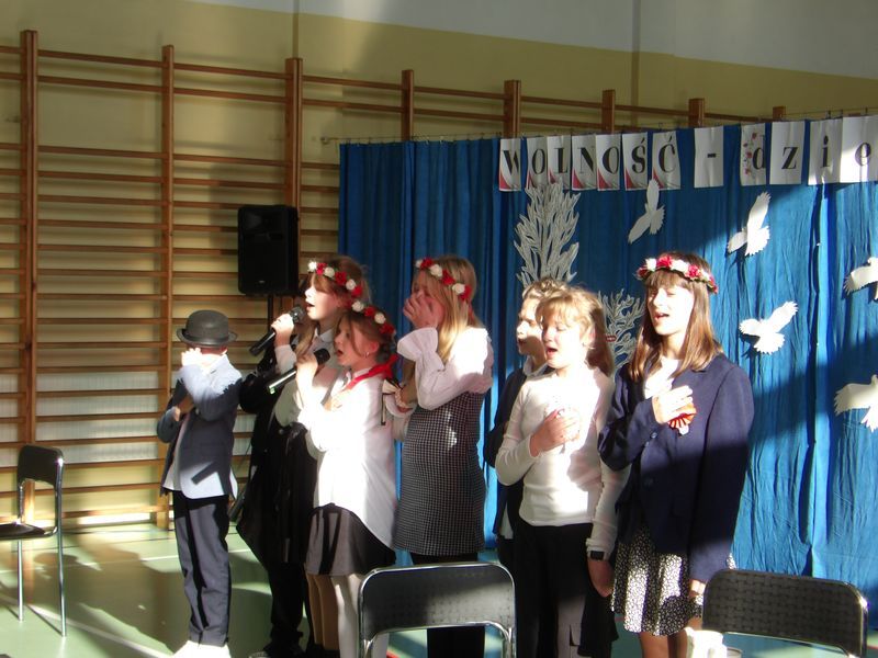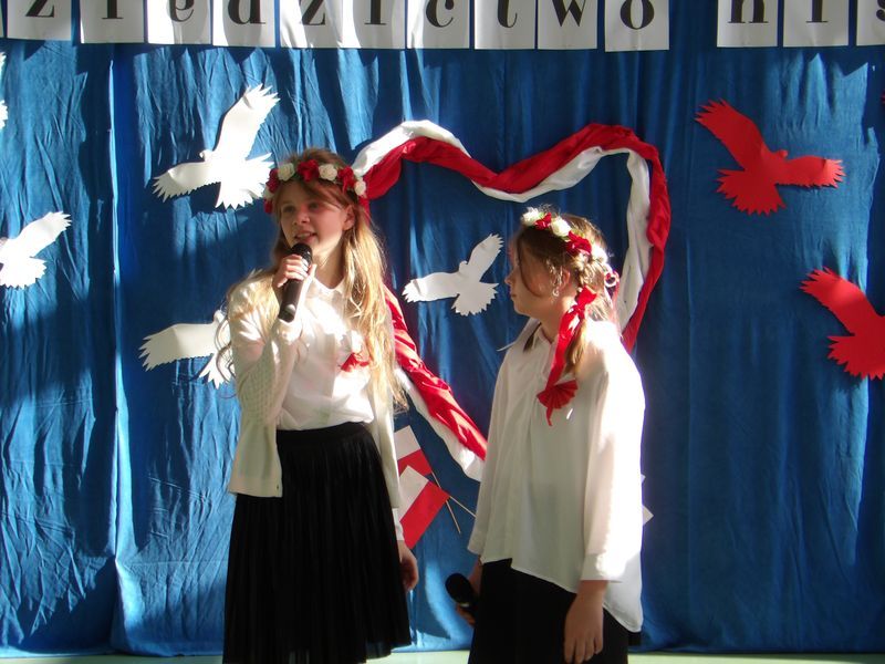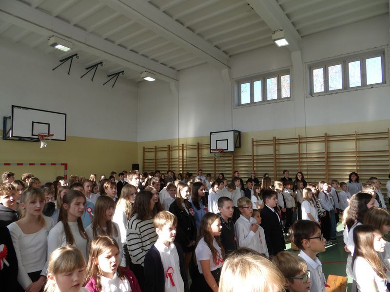Uroczystość rozpoczęliśmy od wspólnego odśpiewania Mazurka Dąbrowskiego, włączając się tym samym w ogólnopolską akcję „Szkoła do hymnu”. Chwilę później uczniowie klasy 5b, z gościnnym udziałem ucznia z klasy 5a oraz uczennic z klas 4a i 4b, zaprezentowali piękne widowisko słowno-muzyczne, które wprowadziło wszystkich w patriotyczny nastrój.
